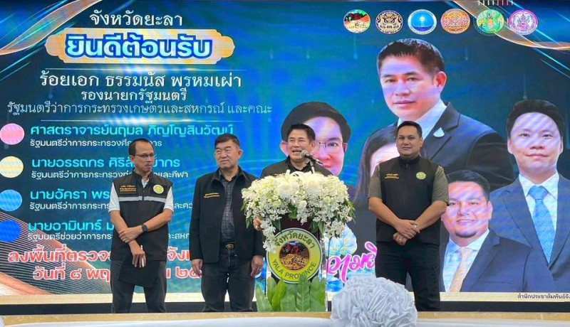 รองอธิบดีกรมส่งเสริมสหกรณ์และเจ้าหน้าที่สำนักงานสหกรณ์จังหวัดยะลา ร่วมให้การต้อนรับ ร้อยเอก ธรรมนัส พรหมเผ่า รองนายกรัฐมนตรี และรัฐมนตรีว่าการกระทรวงเกษตรและสหกรณ์ ในการลงพื้นที่ตรวจราชการจังหวัดยะลา