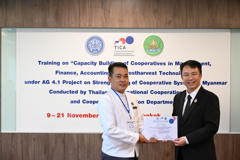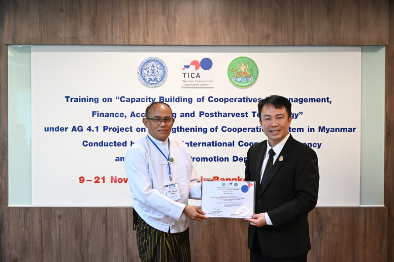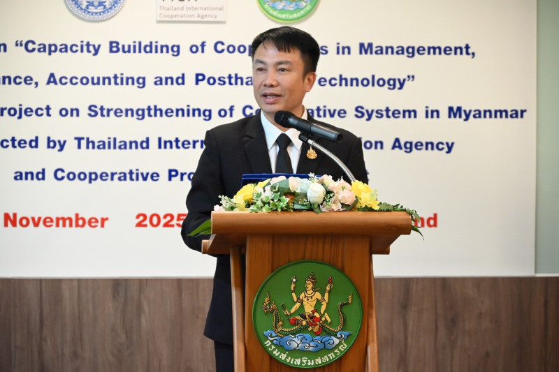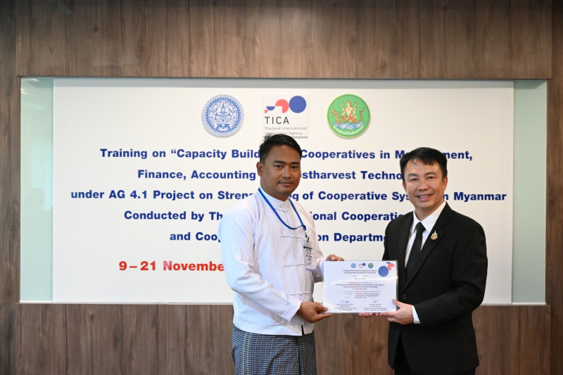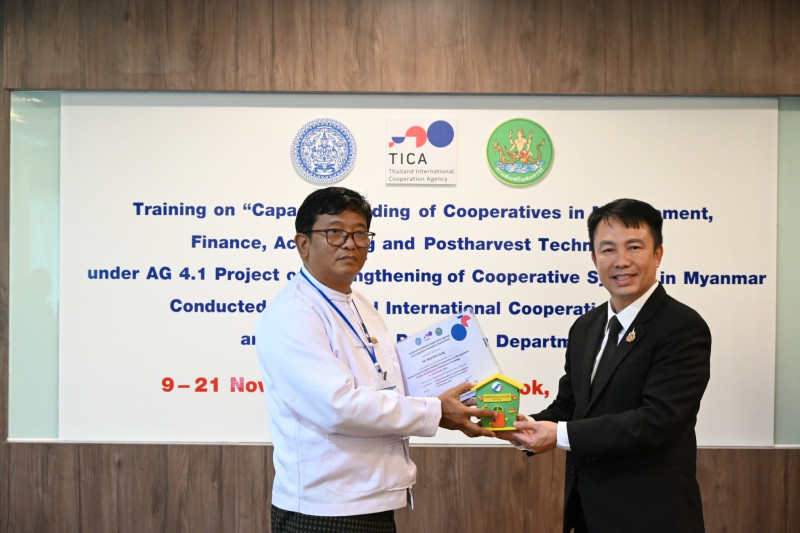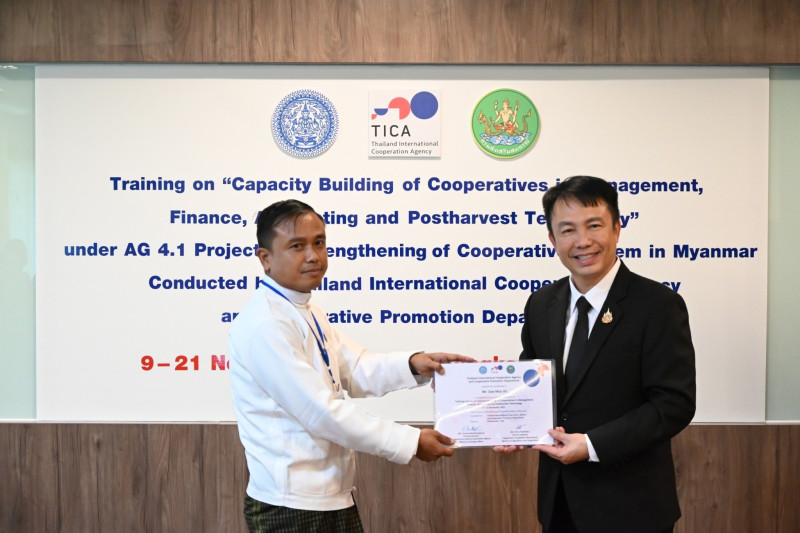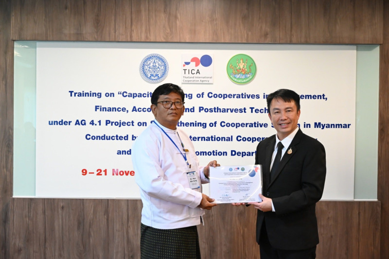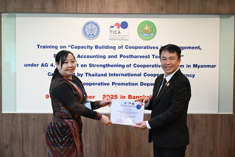 20 พฤศจิกายน 2568 นายนิรันดร์ มูลธิดา อธิบดีกรมส่งเสริมสหกรณ์ เป็นประธานในพิธีปิดโครงการฝึกอบรมหลักสูตร “การพัฒนาศักยภาพสหกรณ์ด้วยการจัดการ ด้านการเงิน การบัญชี และเทคโนโลยีหลังการเก็บเกี่ยว” ภายใต้โครงการเสริมสร้างความเข้มแข็งแก่ระบบสหกรณ์ในเมียนมา (AG 4.1 Project on Strengthening of Cooperative System in Myanmar) และมอบประกาศณียบัตรสำหรับผู้ผ่านการอบรม จำนวน 9 คน โดยมี นางสาวปรานอม จันทร์ใหม่ ผู้เชี่ยวชาญ รักษาการในตำแหน่ง ผู้ทรงคุณวุฒิด้านการสหกรณ์ นายพิษณุ พินรอด ผู้อำนวยการสำนักพัฒนาและถ่ายทอดเทคโนโลยีการสหกรณ์ นายนาถ บำรุงพาณิชย์ ผู้อำนวยการกองแผนงาน นางชัชสรัญย์ เลิศเกียรติวงศ์ ผู้อำนวยการกองความร่วมมือเพื่อการพัฒนาระหว่างประเทศ กรมความร่วมมือระหว่างประเทศ และเจ้าหน้าที่ที่เกี่ยวข้อง ร่วมพิธีปิด ณ ห้องรับรอง ชั้น 2 อาคารฝึกอบรมส่วนกลาง สำนักพัฒนาและถ่ายทอดเทคโนโลยีการสหกรณ์ เขตดุสิต กรุงเทพมหานคร
