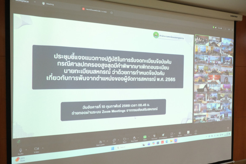 10 กุมภาพันธ์ 2569 นายนิรันดร์ มูลธิดา อธิบดีกรมส่งเสริมสหกรณ์ เป็นประธานการประชุมชี้แจงแนวทางปฏิบัติในการรับจดทะเบียนข้อบังคับ กรณีศาลปกครองสูงสุดมีคำพิพากษาเพิกถอนระเบียบนายทะเบียนสหกรณ์ ว่าด้วยการกำหนดข้อบังคับเกี่ยวกับการพ้นจากตำแหน่งของผู้จัดการสหกรณ์ พ.ศ. 2565 โดยมี นายประวัติ แดงบรรจง รองอธิบดีกรมส่งเสริมสหกรณ์ นายรุ่งโรจน์ สรวุฒิพิบูลย์ ผู้อำนวยการกองพัฒนาสหกรณ์ด้านการเงินและร้านค้า ผู้ตรวจราชการกรมฯ ผู้เชี่ยวชาญ และเจ้าหน้าที่ที่เกี่ยวข้อง เข้าร่วมประชุม ณ ห้องประชุม 226 กรมส่งเสริมสหกรณ์ เทเวศร์ กรุงเทพมหานคร และมีการถ่ายทอดสัญญาณผ่านระบบ Zoom Meeting ไปยังหน่วยงานที่เกี่ยวข้องอีกด้วย