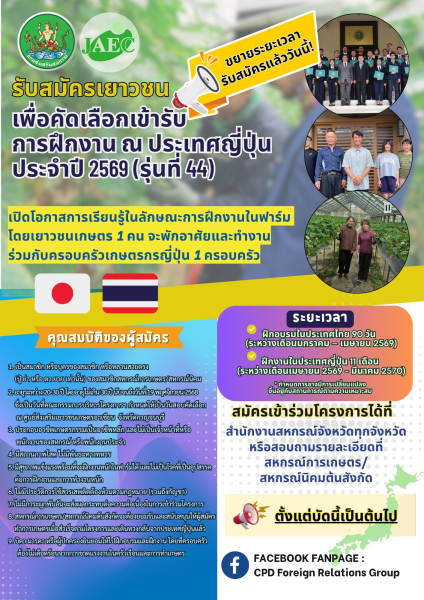 โครงการฝึกงานผู้นำเยาวชนเกษตรไทยในประเทศญี่ปุ่น ปี 2569 (รุ่นที่ 44)